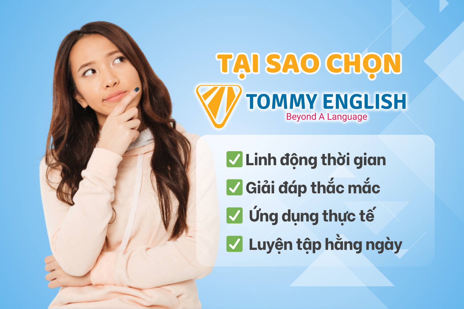 Tại Tommy English, chúng tôi thấu hiểu rằng việc học ngôn ngữ không chỉ là việc ghi nhớ từ vựng hay ngữ pháp. Đó là một hành trình khám phá bản thân và thế giới. Chúng tôi cam kết đồng hành cùng bạn vượt qua mọi rào cản, giúp bạn tự tin giao tiếp và mở rộng chân trời tri thức của mình! 🚀